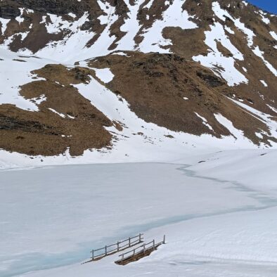Senza difficoltà tecniche, raggiungeremo il Lago Fallére (2.427 m), in piena fase di disgelo. Il lago è incastonato in una suggestiva conca ai piedi della parete sud del Mont Fallère. Da qui potremo godere di una vista straordinaria sulla Grivola, sul Monte Emilius e sull’intero settore del Gran Paradiso.