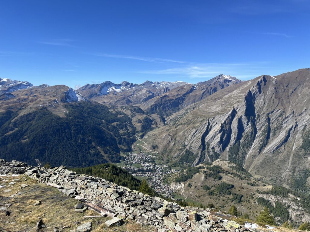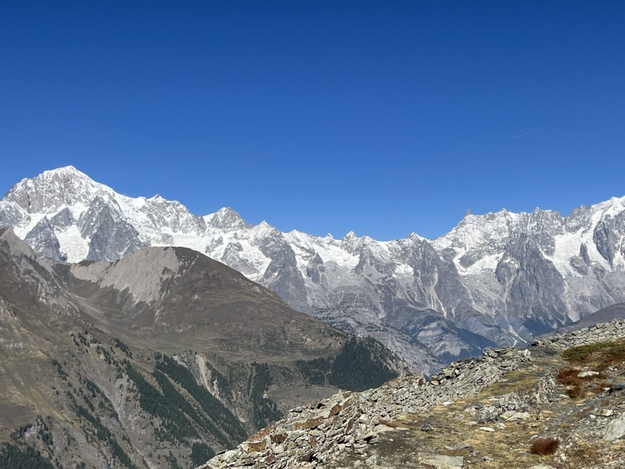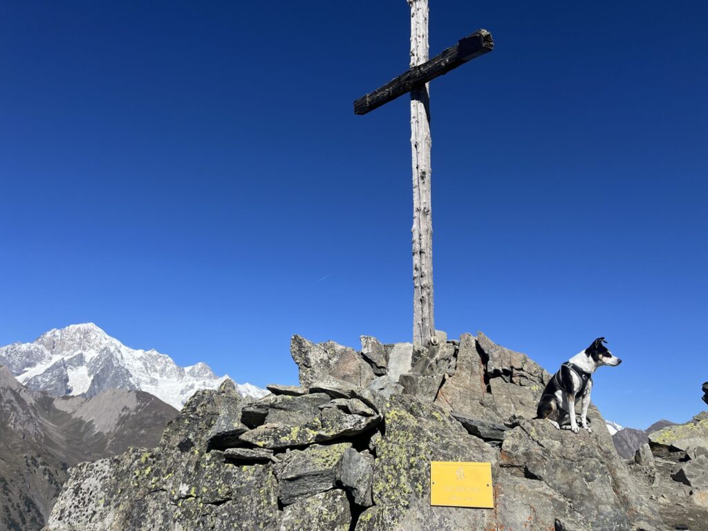 Dalla croce di vetta, lo spettacolo è mozzafiato: davanti a noi l’anfiteatro del Monte Bianco, con le Grandes Jorasses, il Dente del Gigante, e, alle nostre spalle, anche l’inconfondibile profilo del Cervino. Ai nostri piedi si stendono La Thuile con il Colle del Piccolo San Bernardo e, sull’altro versante, Courmayeur.